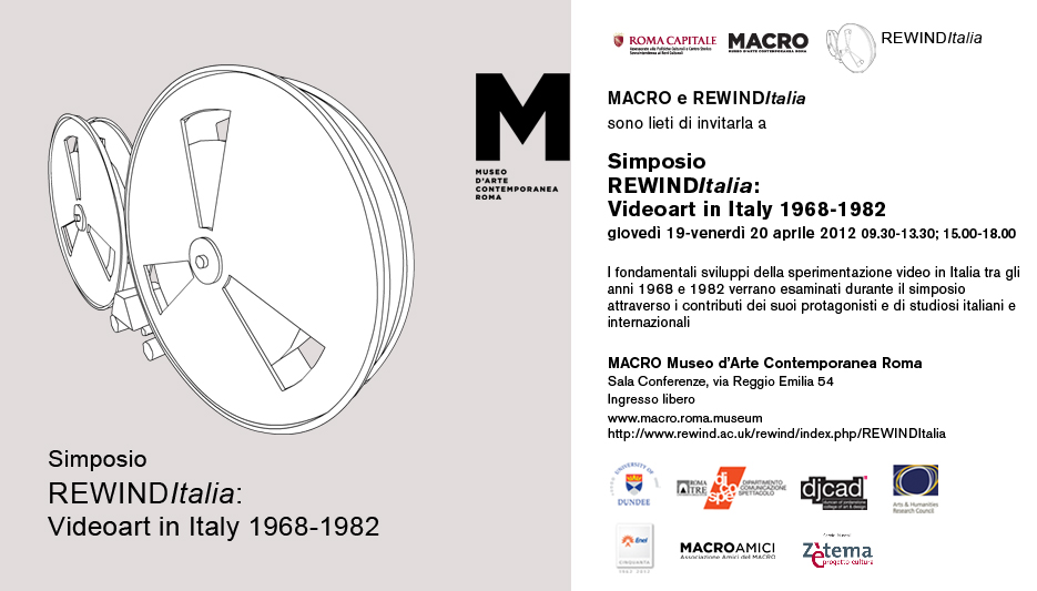 The research project REWINDItalia held its first Symposium ‘REWINDItalia: Videoart in Italy 1968-1982’ in Rome on April 19th-20th 2012, at MACRO – Museum of Contemporary Art. The research project was funded by the AHRC and the event was supported by the Di.Co.Spe, the Department of Communication & Spectacle of University Roma Three and DJCAD, University of Dundee.