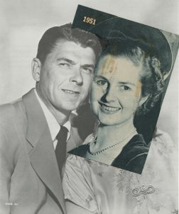 Here we can see the early stages of development for Death Valley Days. In this collage of Ronald Reagan and Margaret Thatcher, Gorilla Tapes uses a satirical approach to critique the roles of Reagan and Thatcher in power. Both are seen as ideological allies of conservatism. This collage reimagines Ronald Reagan and Margaret Thatcher through the satirical lens of the Gorilla Tapes. By referencing Reagan’s old TV role in Death Valley Days, this further adds to the tactic of mocking and creating an unserious perception of Reagan.