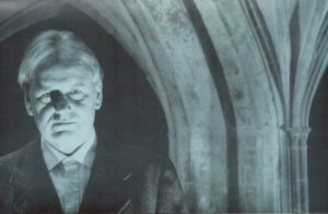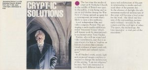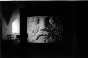 In the absence of daylight the subterranean medieval architecture of the crypt becomes a focal point of the work – revealed by the camera and cool light of video. The space, the technology, the lone spectator – a vital part of the encounter.
