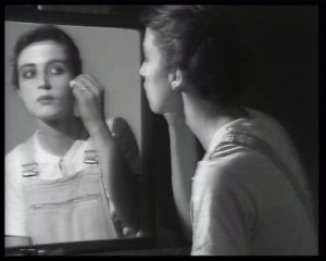 The mirror reflects her applying make-up to her face with very dry, precise gestures. During these actions two sound tracks can be heard: they are records of two psychological analysis on schizophrenia, evoking a double personality. At some point, the performance is suddenly interrupted by another image, showing the face of the artist. Then the action goes back to what we could call the ‘mirror scene’. At that point she drops the concealer and takes a dark drawing pen: and like on canvas, evoking the traditional image and position of the painter, and the use of mirror in self-portraits, she begins to draw on the mirror in front of her.