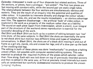 “When Partridge began to explore the then new-fangled edit-suite in the late 1970’s, he incorporated all these elements and added to them the montage film tradition (suitably altered) at a time when extreme duration and the single take were still seen as defining the nature of video as against cinema. This was far-sighted in staking out the artist’s claim to, so to speak, cut and paste videotape well ahead of its commercial exploitation in advertising and television. Episodes Interposed, 1979, whose denotative title affirms montage as an act of cutting into time and action, is a good example.