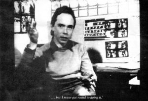 FOOTNOTE 1 Pieces I Never Did was first screened as an installation of a work in progress in a London Video Arts show at the Acme Gallery, Covent Garden (February 1979) Ian Bourn showed Lenny’s Documentary at the same event, and Helen Chadwick selected both pieces for the 1979 Hayward Annual which was curated by several artists. Kevin Atherton had been selected by another artist to show video, but when we saw the arrangements for screening the video component of the exhibition – a small screened off area with a thinly spread programme – Kevin and I objected and asked the Arts Council’s representative for equal billing with painting and sculpture in the form of a continuous display of each video piece. This was seen to be too difficult technically, so Kevin and I withdrew our pieces from that years Hayward Annual. – DC
