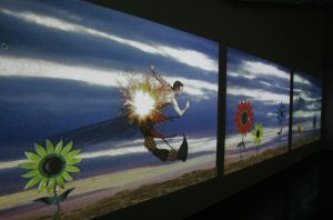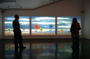 At the time of its inception, FlowerField was a part of Lei Cox’s Ultra Reality Series, which explored ecology and the impact of human beings on the planet. The interactive element of the original piece sarcastically criticised mankind’s control over its environment. The animation was created in a blue-screen studio, using clay-mation techniques, and assembled with a Quantel Harriet – released in 1990, this allowed for the manipulation of live graphics over video. The interactivity was based on pressure pads hidden under a carpet of Astroturf that triggered different sound clips to be ‘spoken’ by the acrylic flowers. Skies over FlowerField, was exhibited as a new, non-interactive version, for the first time at the Electronically Yours exhibition at the Metropolitan Museum of Photography in Tokyo in 1998. The original animation was played from Betacam tapes; the work on view in Gallery 2 is a Quicktime, digital version played from a QuickTime file. FlowerField has been exhibited extensively since 1995, each time adapted to the specific requirements and potential of the venues.
