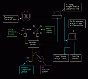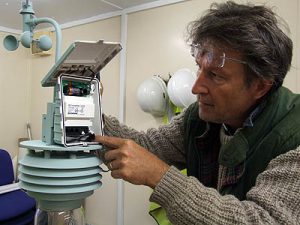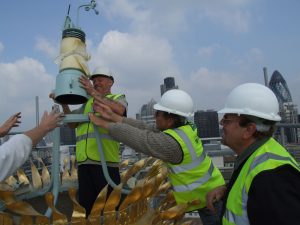 Installing the weather station on the camera housing, 2009 A computer controlled digital camera provided a 360-degree panoramic view from the top of the Monument. Changes to the image display were facilitated by a dedicated computer system with interfaces and software that modified the image in response to changes in the ambient conditions of the surrounding environment, specifically wind velocity and direction, average temperature and barometric pressure. This data was used to modify the live image stream from the camera in a number of different ways relating to the changes in the weather, so for example the speed of the image stream related to the wind speed, and the rotation of the image related to the wind direction. Ambient temperature modified the colour of the image, whilst changes in the pressure modified the image contrast. The resulting images which were designed to be presented on a dedicated outdoor screen adjacent to the Monument, provided a dynamic visual record of the surrounding environment of the Monument in the heart of the City of London. Although the project is now completed and the live image is longer being produced, some examples of images and time-lapse sequences produced by the installation can be seen on the City of London’s Monument web site.