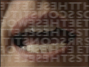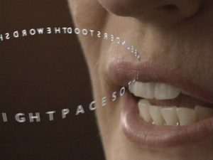 The Sounds of These Words was SP’s four minute intervention. For this new work SP used another TV convention – the talking head – one of the most ubiquitous images on television. Here some of the statements made by the woman are displayed on the screen as text which is then animated and manipulated. An extreme close-up of the mouth speaking is slowed down, almost to a stop, and then speeded up to a fast rate so that the appreciation of the lips forming the words is heightened. The play between the spoken word, the animated text and the act of speaking are brought together with an assured and telling touch. The English language is capable of great subtlety and we have many and various way of expressing what we wish to say compared with other languages. We measure our words carefully not always just to be truthful (or not) but to shape them according to how we think they may be received. For me The Sounds of These Words brings these questions into sharp focus.” – Anna Ridley