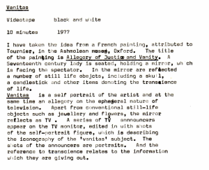 “Vanitas came after seeing a French painting attributed to Nicolas Tournier at the Ashmolean Museum, Oxford, An Allegory of Justice and Vanity . Vanitas is a self-portrait of the artist and at the same time an allegory of the ephemeral nature of television.’ – Tamara Krikorian 1978