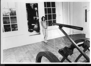 Elaine Shemilt at the opening of her One-Person exhibition, South Hill Park, 1982. Featuring multi media installation “Women Soldiers” screen print behind the artist; foreground Women Soldiers (sculpture); included the video work of the same name.