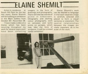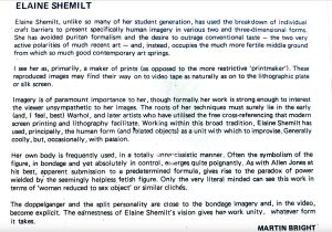 The doppelgänger and the split personality are close to the bondage imagery and, in the video become explicit. The earnestness of Elaine Shemilt’s vision gives her work unity, whatever form it takesMartin Bright, October 1982 from the catalogue for “Elaine Shemilt- Recent Work’, South Hill Park Arts Centre Bracknell, UK